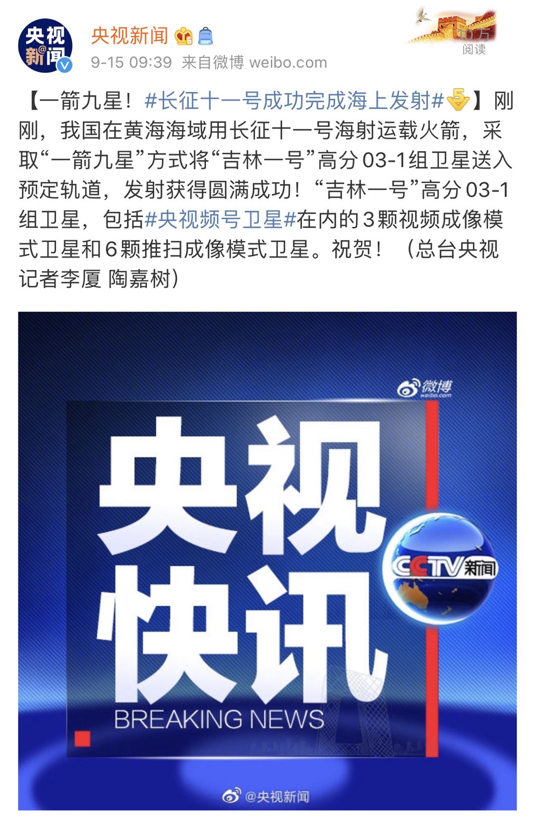 我国在黄海海域用长征十一号海射运载火箭,采取“一箭九星”方式将“吉林一号”高分03-1组卫星送入预定轨道,发射获得圆满成功!“吉林一号”高分03-1组卫星,包括央视频号卫星在内的3颗视频成像模式卫星和6颗推扫成像模式卫星。