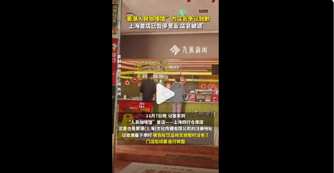 11月8日,“要潮人民咖啡馆”为店名争议致歉,声明中写道“我们创立品牌的初心,是对于‘人民’二字的尊重和珍视,我们将严格按照注册商标规范各个场景应用。中国大陆地区迅速调整为‘要潮人民咖啡馆’,中国香港、中国澳门地区及海外地区仍然为‘人民咖啡馆’。