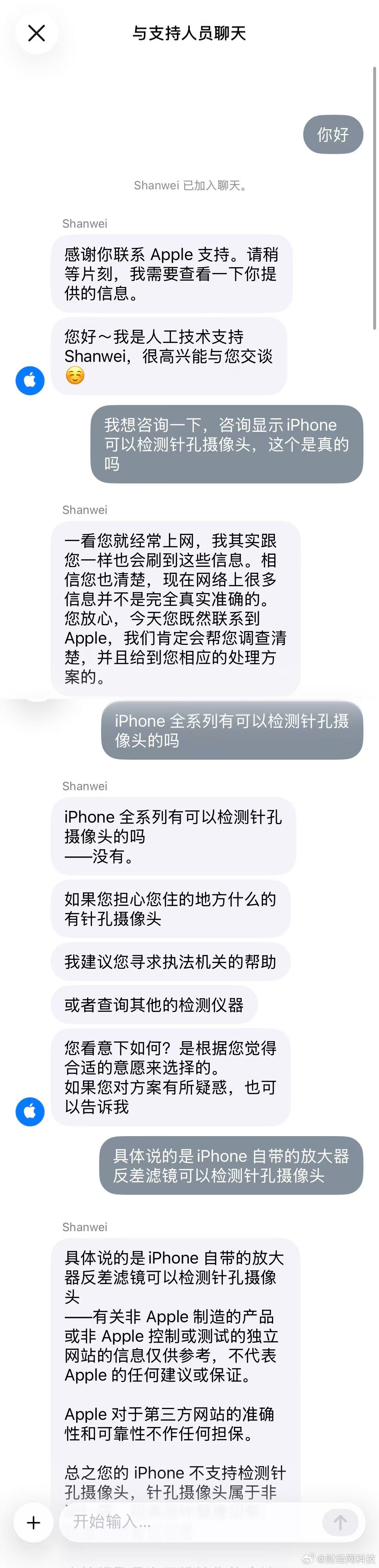 近日有网友发帖称iPhone放大器可以检测针孔摄像头:打开iPhone自带放大器,点击底部滤镜图标选择红底黑字或鲜暖色反差滤镜,关闭所有光源,就可以排查是否有针孔摄像头。对此,编辑咨询Apple技术支持人员,对方称iPhone全系列没有可以检测针孔摄像头的,有关非Apple控制或测试的独立网站信息仅供参考,不代表Apple的任何建议或保证,iPhone不支持检测针孔摄像头。