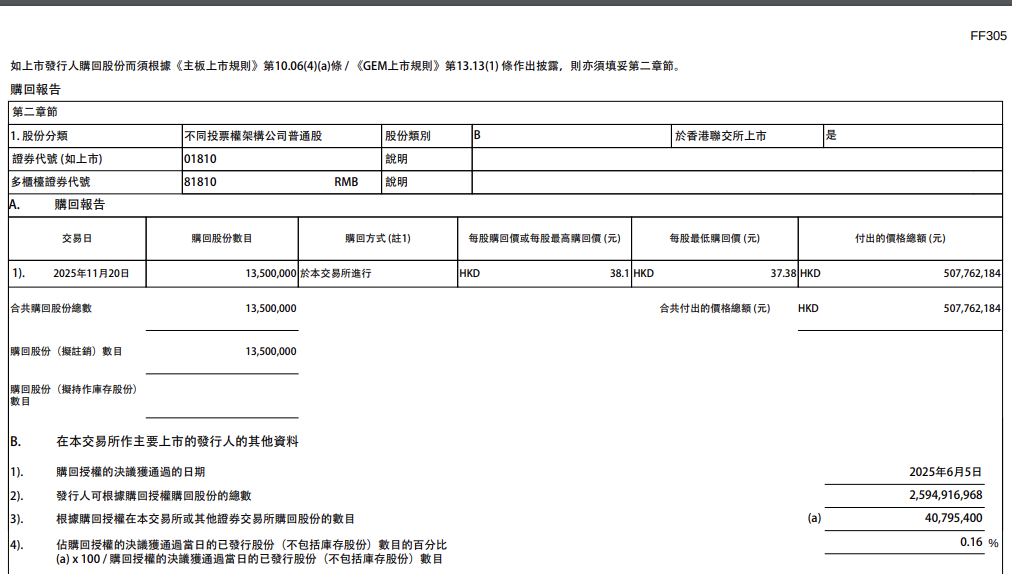 小米集团公告称,于11月20日斥资5.078亿港元回购1350万股B类股份,每股购回价为37.38港元-38.1港元。