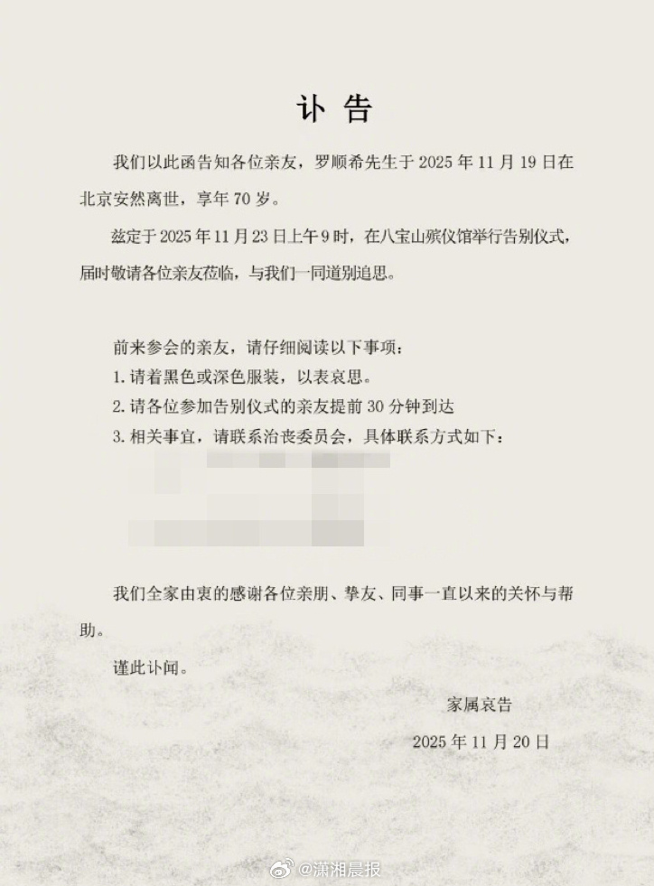11月20日的经纪人在朋友圈发布讣告,表示罗晋的父亲罗顺希先生于11月19日在北京安然离世,享年70岁。目前罗晋本人及家人正处于悲痛之中,全心处理各项事务