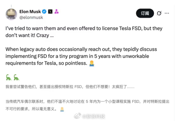 马斯克回应其他车企不想要FSD:他们简直疯了。