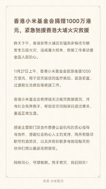 11月27日,香港小米基金会宣布捐赠1000万港元,紧急驰援香港大埔火灾救援。