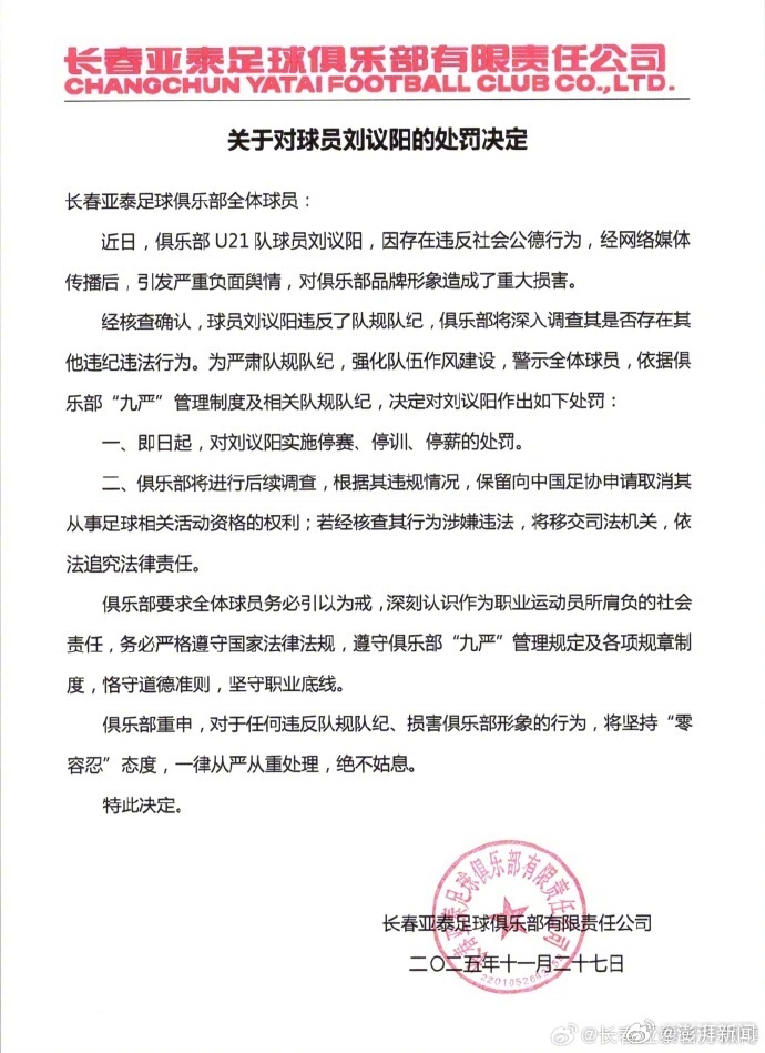 11月27日,长春亚泰官方发布公告表示,俱乐部U21队球员刘议阳因存在违反社会公德行为,经网络媒体传播后引发严重负面舆情,对俱乐部品牌形象造成了重大损害,对刘议阳实施停赛停训停薪的处罚。俱乐部将进行后续调查,根据其违规情况,保留向中国足协申请取消其从事足球相关活动资格的权利;若经核查其行为涉嫌违法,将移交司法机关依法追究法律责任。