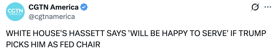 美国白宫国家经济委员会主任哈塞特11月30日表示,如果特朗普提名他担任美联储主席,他将“乐意效劳”。