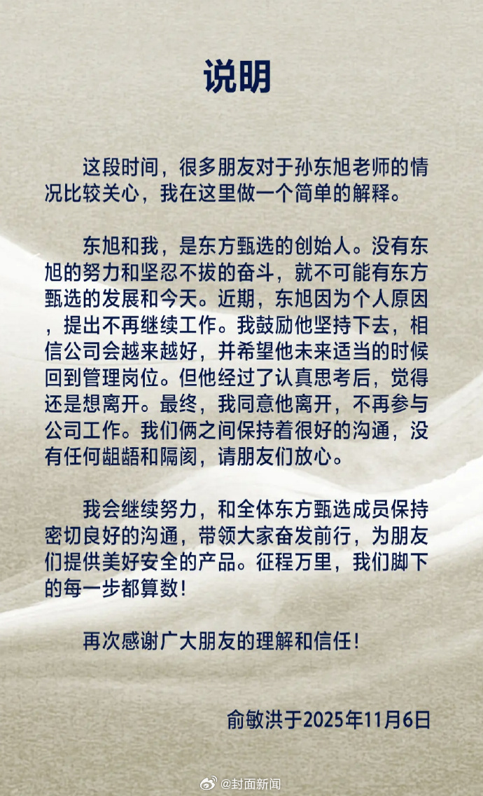 企查查APP显示,近日东方甄选(北京)科技有限公司发生工商变更,孙东旭卸任法定代表人、经理、执行董事职务,由俞敏洪接任。目前东方甄选科技母公司东方优选(北京)科技有限公司尚未发生变更,孙东旭仍为法定代表人、执行董事、经理。据此前报道,11月6日俞敏洪发文确认孙东旭从东方甄选离职,并表示我们俩之间保持着很好的沟通,没有任何龃龉和隔阂,请朋友们放心