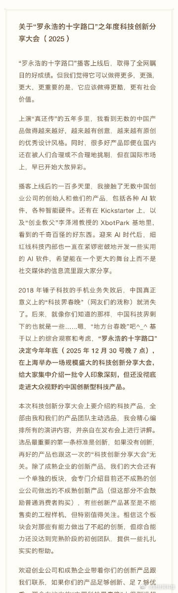 12月1日,罗永浩发文宣布“罗永浩的十字路口”之年度科技创新分享大会(2025)将于今年12月30日在上海召开。文中,罗永浩回应播客爆火:“罗永浩的十字路口”播客上线后,取得了全网瞩目的好成绩。但我们觉得它可以做得更多,更强,更大,更重要的是,它应该做得更酷,更有社会价值。
