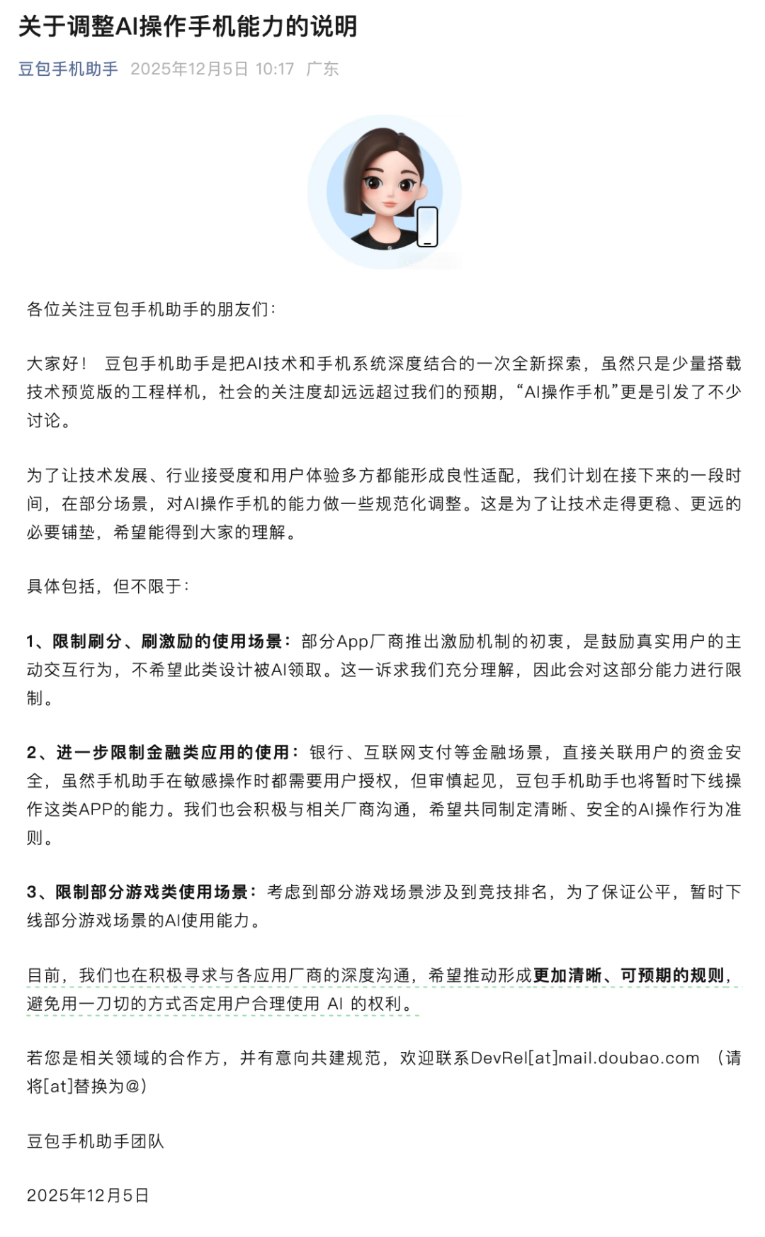 12月5日,“豆包手机助手”账号发文称,团队将在接下来的一段时间,在部分场景,对AI操作手机的能力做一些规范化调整。包括但不限于对刷分、刷激励的使用场景进行能力限制,进一步限制金融类应用的使用,限制部分游戏类使用场景。团队称正在积极寻求与各应用厂商的深度沟通,希望推动形成更加清晰、可预期的规则,避免用一刀切的方式否定用户合理使用AI的权利。