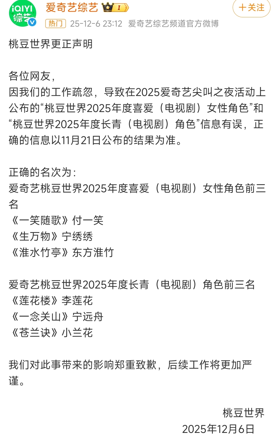 当晚,@爱奇艺综艺 发布更正声明:因工作疏忽,导致在2025爱奇艺尖叫之夜活动上公布的“桃豆世界2025年度喜爱(电视剧)女性角色”和“桃豆世界2025年度长青(电视剧)角色”信息有误,正确的信息以11月21日公布的结果为准。对此事带来的影响郑重致歉,后续工作将更加严谨。