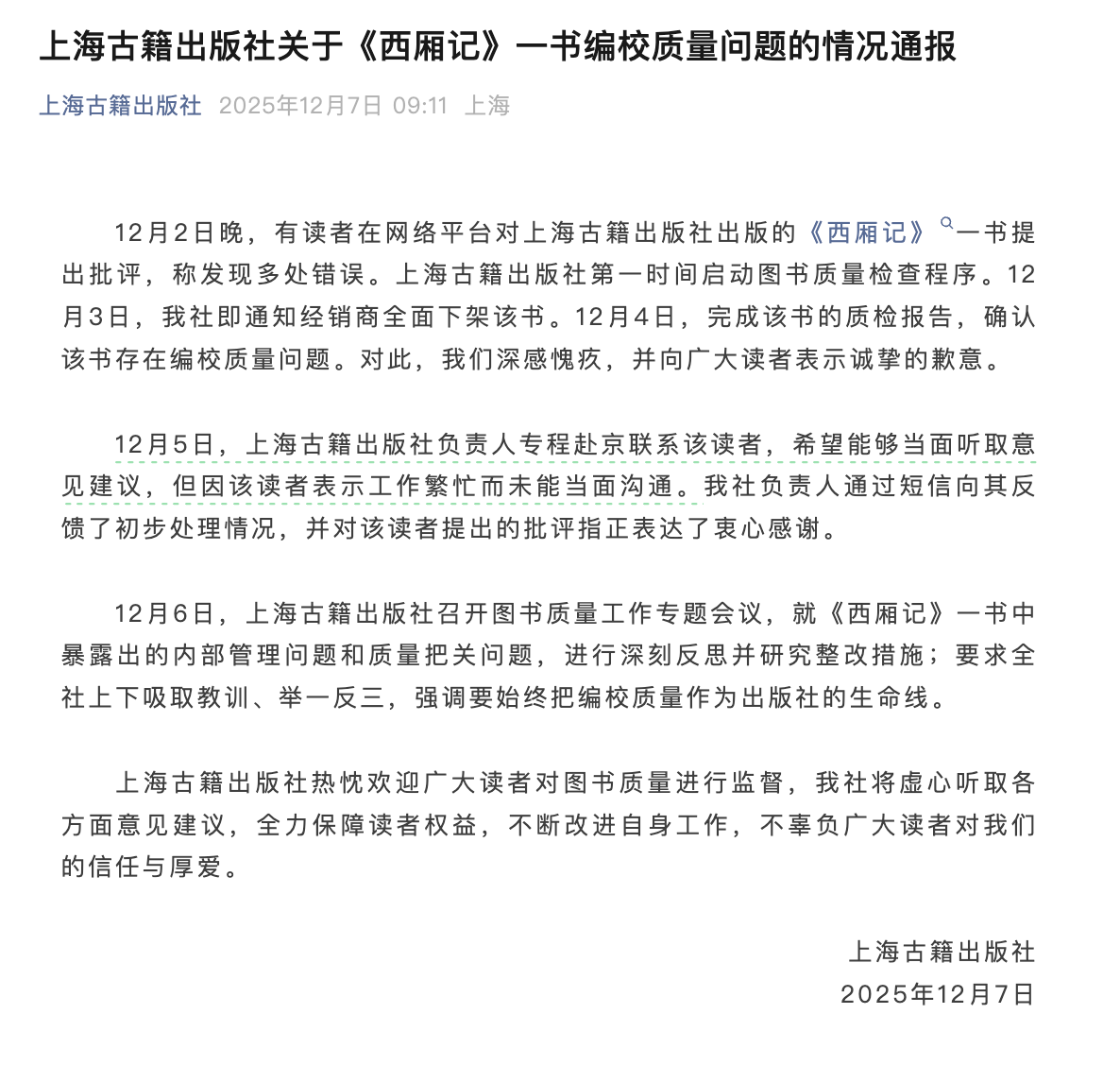 12月7日,上海古籍出版社发布关于《西厢记》一书编校质量问题的情况通报:12月2日晚,有读者在网络平台对上海古籍出版社出版的《西厢记》一书提出批评,称发现多处错误。上海古籍出版社第一时间启动图书质量检查程序。12月3日,我社即通知经销商全面下架该书。12月4日,完成该书的质检报告,确认该书存在编校质量问题。对此,我们深感愧疚,并向广大读者表示诚挚的歉意。
