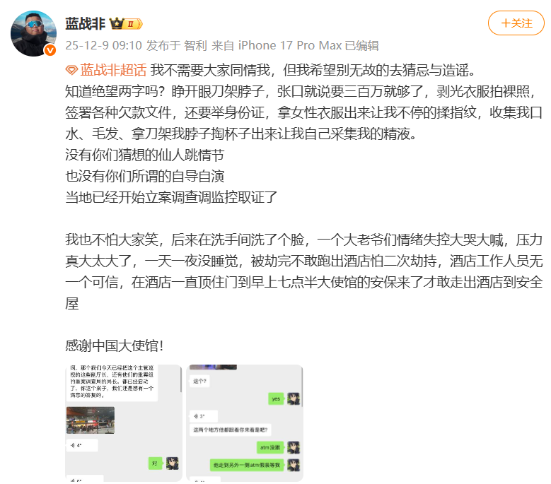 据此前报道,12月9日,#蓝战非被绑架#登上热搜引热议,记者发现,大V蓝战非最早在超话内发布动态自称被绑架。蓝战非发文称,其在南非开普敦一家五星级酒店内被一人伙同两名黑人持刀劫持,事件持续四五小时。绑匪据称买通机场与酒店人员,掌握其行程,并试图胁迫其转账、申请网贷,同时收集指纹、毛发、精液等生物信息以威胁伪造“强奸”案阻止报警。