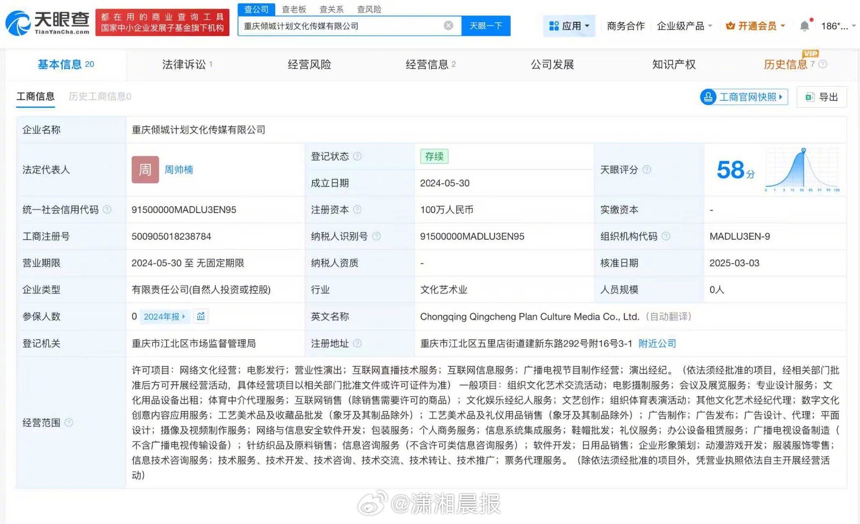 公开信息显示,其团队关联公司为重庆倾城计划文化传媒有限公司。潇湘晨报记者查询天眼查发现,重庆倾城计划文化传媒有限公司成立于2024年5月,法定代表人为周帅楠,经营范围含网络文化经营、电影发行、营业性演出、互联网直播技术服务等。股东信息显示,该公司由周帅楠、韩晓雪共同持股。