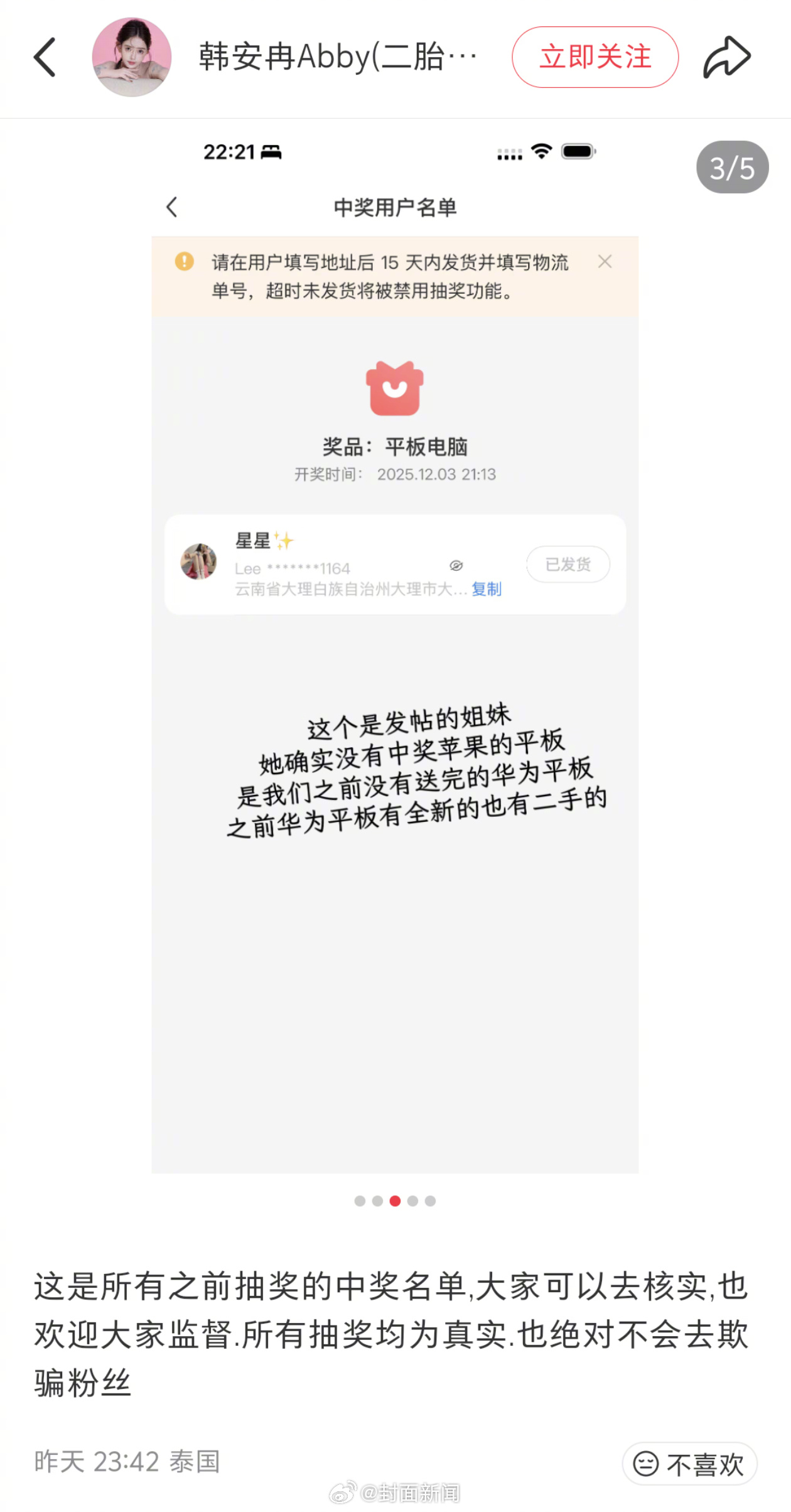 近日,有网友发帖称在韩安冉直播间抽中平板电脑,结果收到的是二手平板,引发热议。对此,韩安冉连发多条声明回应,并晒出购买记录以及中奖名单。她称这次的所有手机和平板均为实体店购买,发视频之前有开始抽奖,抽了两台之前剩下的华为平板。之前一共采购8台全新,10台二手平板,除此之外所有的手机和平板均为全新。这次的事件出现后,不会再去采购二手。