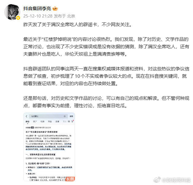 发文称:最近关于红楼梦悼明说的内容讨论很热烈。我们发现,除了对历史、文学作品的正常讨论,也出现了不少史实错误或是没有依据的猜测,除了满汉全席吃人,还有夫妻肺片也是吃人,华伦天奴祖上是满清贵族等等。抖音辟谣团队的同事这两天一直在搜集权威媒体报道和资料,对这些热议的争议信息做了核查,初步梳理了10个不实或者争议较大的点。现在在抖音搜关键词,就能看到查证结果,对应的内容也在持续做处置。还是那句话,对历史和文学作品的讨论,可以有自己的观点和解读。但不管何种观点,都要有事实为前提,理性讨论,拒绝盲目吃瓜。