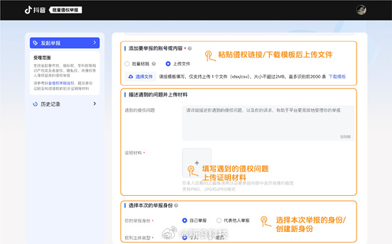 近日抖音升级批量侵权举报工具用户可在PC端网站通过粘贴链接上传文件的形式一键发起批量举报其中上传表格单次最多可提交2000条举报内容支持举报视频图文抖音账号资料等多个涉嫌侵权的场景12月18日起个人及企业用户均可通过抖音批量侵权举报网站使用该服务