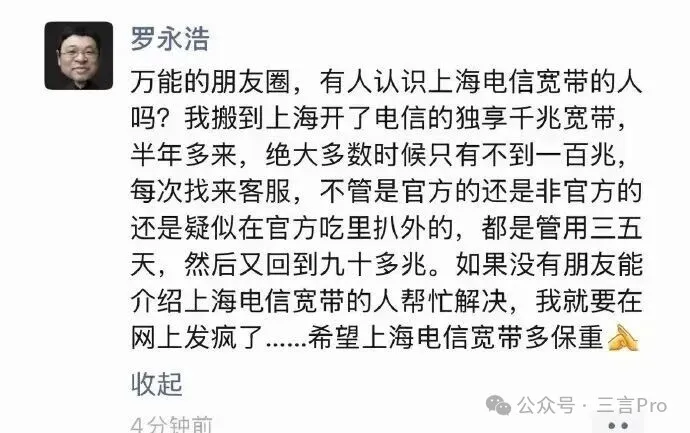 近日,罗永浩在朋友圈吐槽上海电信宽带,称独享千兆宽带实际不到百兆,并放话再得不到解决将“在网上发疯”: