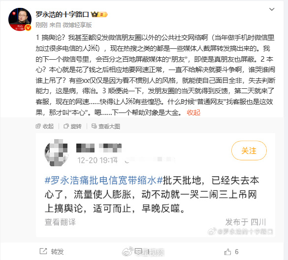 12月21日,@罗永浩的十字路口 发文回应朋友圈吐槽电信宽带,强调本心是花钱后网速应正常,罗永浩称问题当天获反馈,次日客服上门,网速现已快得“让人惶恐”。他呼吁普通用户也应获同等客服响应,并预告下一个帮助对象是“大金”。