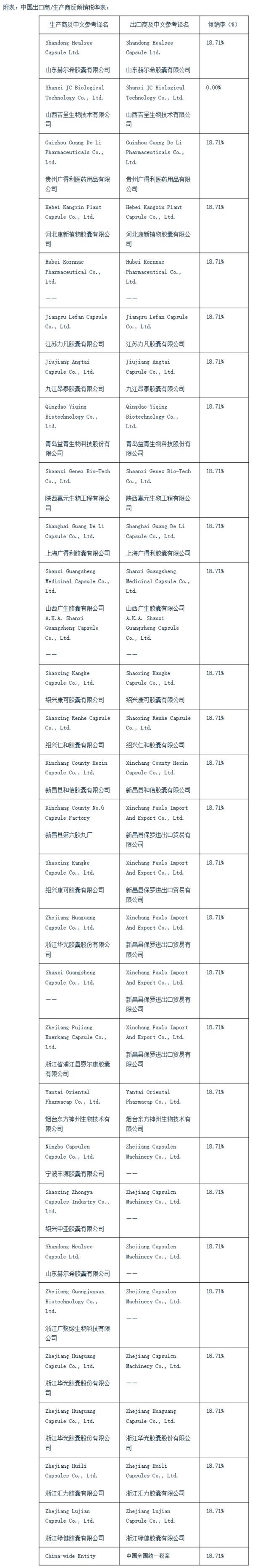 与此同时,美国商务部对进口自中国、巴西、印度和越南的硬质空心胶囊作出反补贴终裁:裁定江苏力凡胶囊有限公司税率为3.14%、山西吉呈生物技术有限公司税率为8.81%、中国其他生产商/出口商的税率为6.90%。