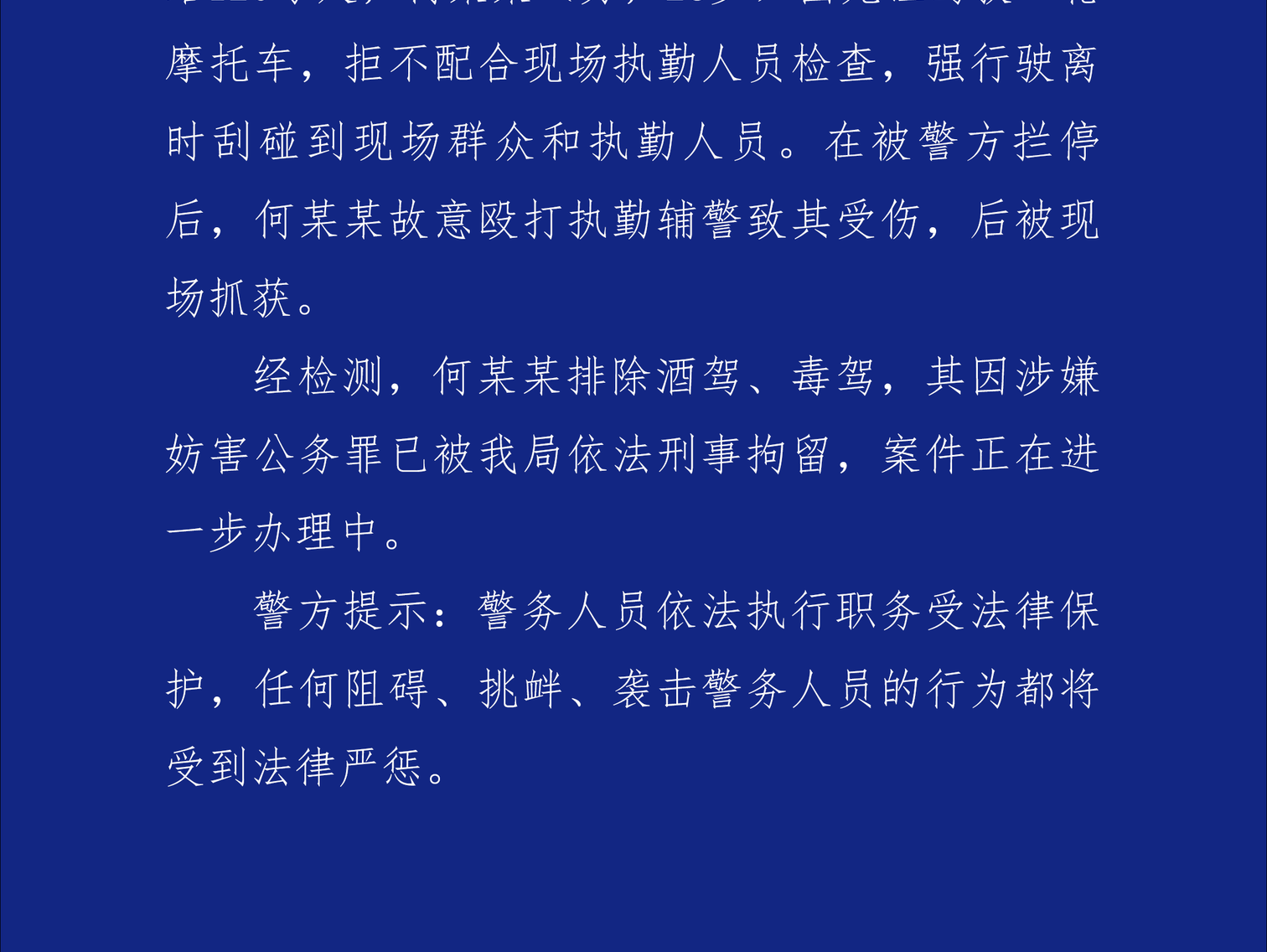 琼海市公安局12月26日发布警情通报:12月24日19时45分许,在琼海市嘉积镇金海路120号处,何某某(男,28岁)因无证驾驶二轮摩托车,拒不配合现场执勤人员检查,强行驶离时刮碰到现场群众和执勤人员。在被警方拦停后,何某某故意殴打执勤辅警致其受伤,后被现场抓获。经检测,何某某排除酒驾、毒驾,其因涉嫌妨害公务罪已被我局依法刑事拘留,案件正在进一步办理中。