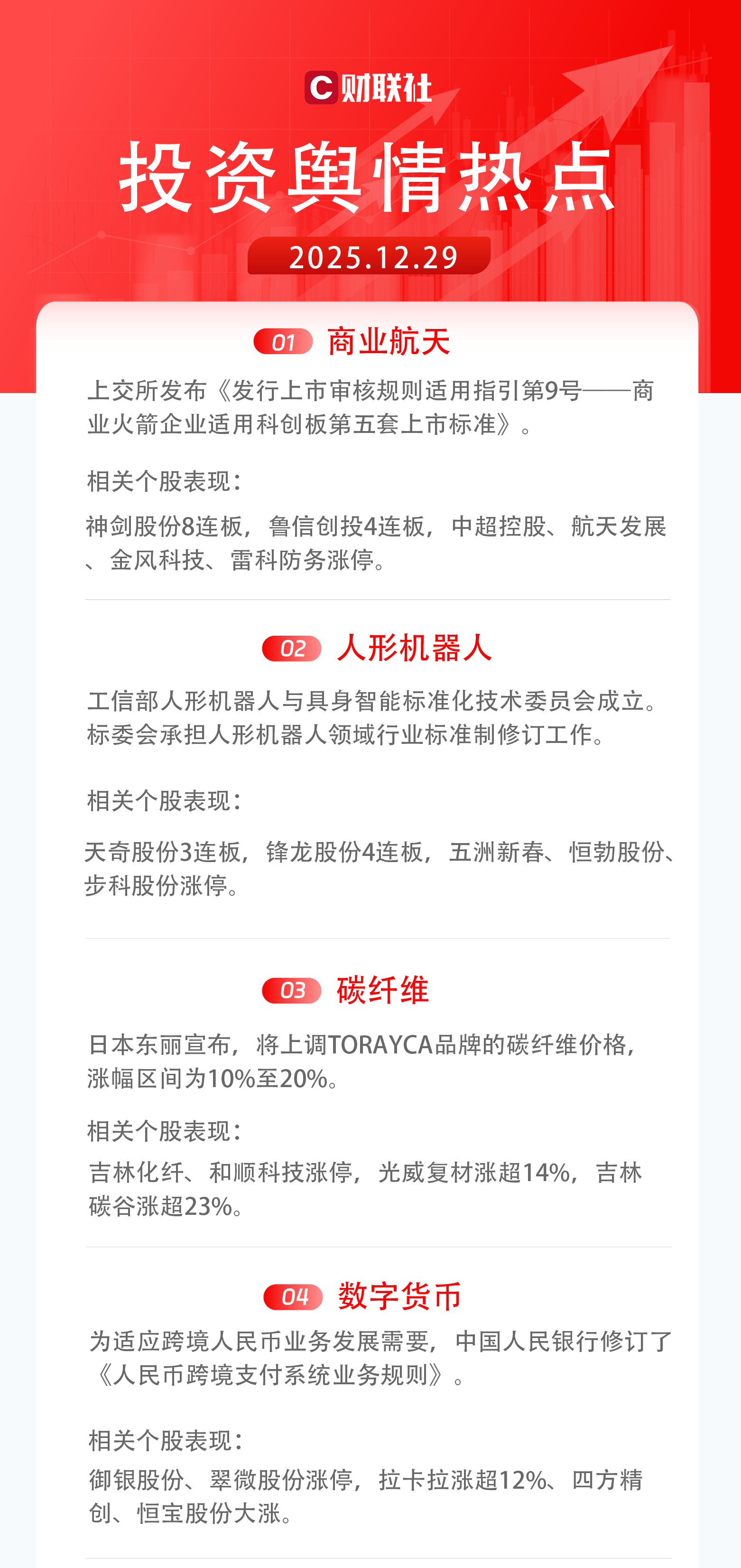 1)商业航天:12月26日,上交所发布《发行上市审核规则适用指引第9号——商业火箭企业适用科创板第五套上市标准》,并自发布之日起实施。2)人形机器人:工信部人形机器人与具身智能标准化技术委员会成立。标委会主要承担人形机器人与具身智能基础共性、关键技术等领域行业标准制修订工作。3)碳纤维:日本东丽宣布,自2026年1月起将上调TORAYCA品牌的碳纤维及其中间产品价格,涨幅区间为10%至20%。4)数字货币:为适应跨境人民币业务发展需要,加强人民币跨境支付系统(CIPS)业务管理,中国人民银行修订了《人民币跨境支付系统业务规则》。