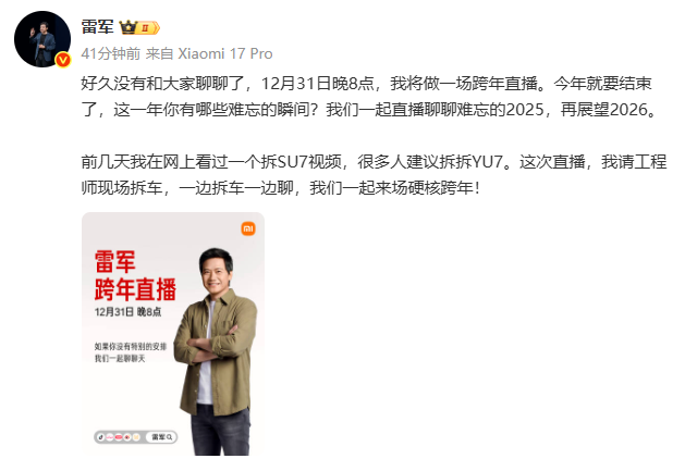 雷军官宣:跨年当晚直播拆车。