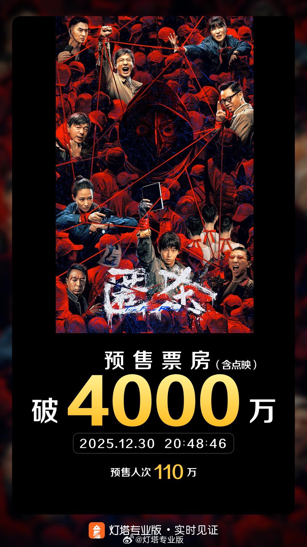 据灯塔专业版实时数据,截至12月30日20时48分,影片《匿杀》点映及预售总票房突破4000万。