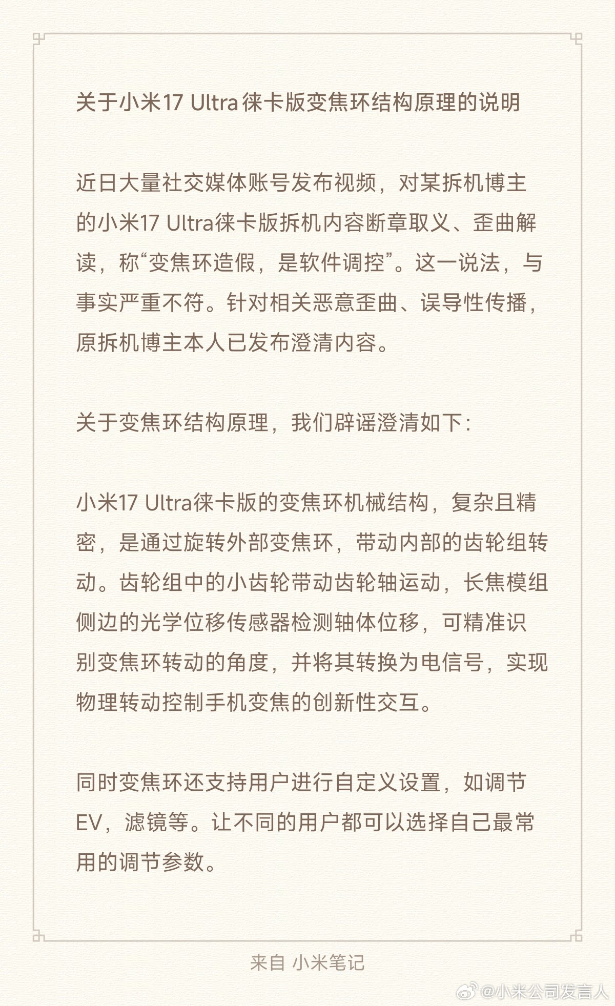 小米官方发布关于小米17Ultra徕卡版变焦环结构原理的说明称,近日大量社交媒体账号发布视频,对某拆机博主的小米17Ultra徕卡版拆机内容断章取义、歪曲解读,称“变焦环造假,是软件调控”。这一说法,与事实严重不符。针对相关恶意歪曲、误导性传播,原拆机博主本人已发布澄清内容。