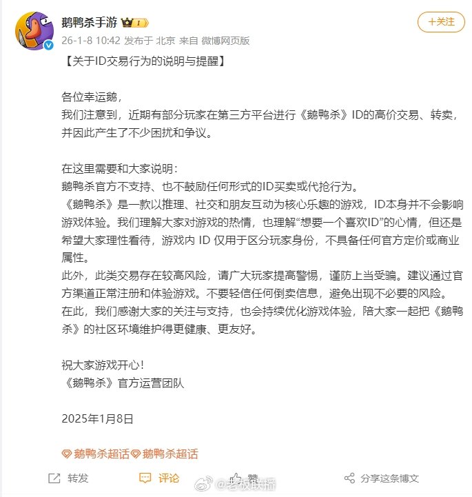 1月8日,鹅鸭杀手游发布关于ID交易行为的说明与提醒:“各位幸运鹅,我们注意到,近期有部分玩家在第三方平台进行《鹅鸭杀》ID的高价交易、转卖,并因此产生了不少困扰和争议。在这里需要和大家说明:鹅鸭杀官方不支持、也不鼓励任何形式的ID买卖或代抢行为。《鹅鸭杀》是一款以推理、社交和朋友互动为核心乐趣的游戏,ID本身并不会影响游戏体验。