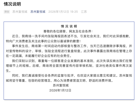 苏州复悦城1月12日发布情况说明:近日,我商场一洗手间内张贴海报因表述不当,引发社会关注,我们对此深感抱歉,特向广大消费者及关注此事的公众致以最诚挚的歉意。事件发生后,商场第一时间启动内部核查与整改工作,当天已迅速撤除涉事海报,并对宣传物料的设计、审核、张贴全流程进行复盘彻查。此次事件暴露出我商场在管理上存在一定疏漏,未能履行好企业应有的社会责任。
