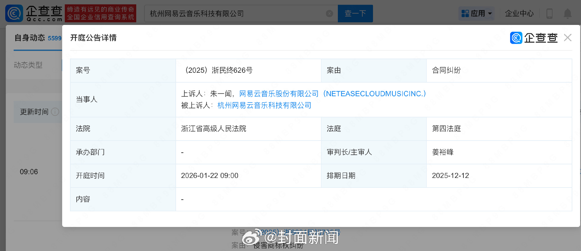 企查查APP显示,近日,杭州网易云音乐科技有限公司作为被上诉人新增一则开庭公告信息,上诉人为朱一闻、网易云音乐股份有限公司(NETEASE CLOUD MUSIC INC.),案由为合同纠纷,案件计划将于1月22日在浙江省高级人民法院开庭。