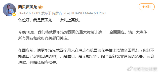 1月16日,@西贝贾国龙 发文:各位好,我是贾国龙,一会儿上高铁。今晚10点,我们将就罗永浩对西贝的重大污蔑诽谤一一全面回应。请广大媒体,所有网友和政府有关部门关注。在回应前,请罗永浩先就四个月来在冷冻有机西蓝花事情上欺骗全国网友(你总不能说自己是刚知道的吧),给西贝,给无数宝妈,给全国餐饮业造成的危害,认真道歉,并赔偿相应损失。
