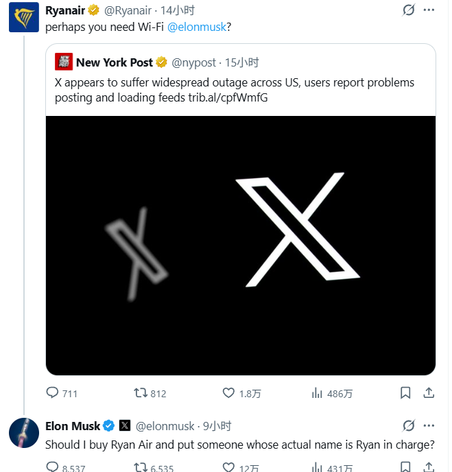 马斯克与瑞安航空CEO迈克尔·奥利里近日就是否应在飞机上安装“星链”设备发生争执。奥利里称没有计划加装星链服务,因为额外设备将导致燃油消耗增加2%。马斯克回应称,“他的信息有误,我怀疑他们不知道如何准确测算燃油消耗的差异”。奥利里15日接受媒体采访时称,马斯克对航空和阻力“一无所知”,并说马斯克“是个蠢货,非常有钱,但说到底还是个蠢货。”马斯克在X上发帖回怼:“瑞安航空的CEO简直是个蠢货。”当一名网友发文建议马斯克可以直接收购瑞安航空并炒掉奥利里时,马斯克回复称“好主意”。当地时间周五,有报道称X在美国出现大范围故障。