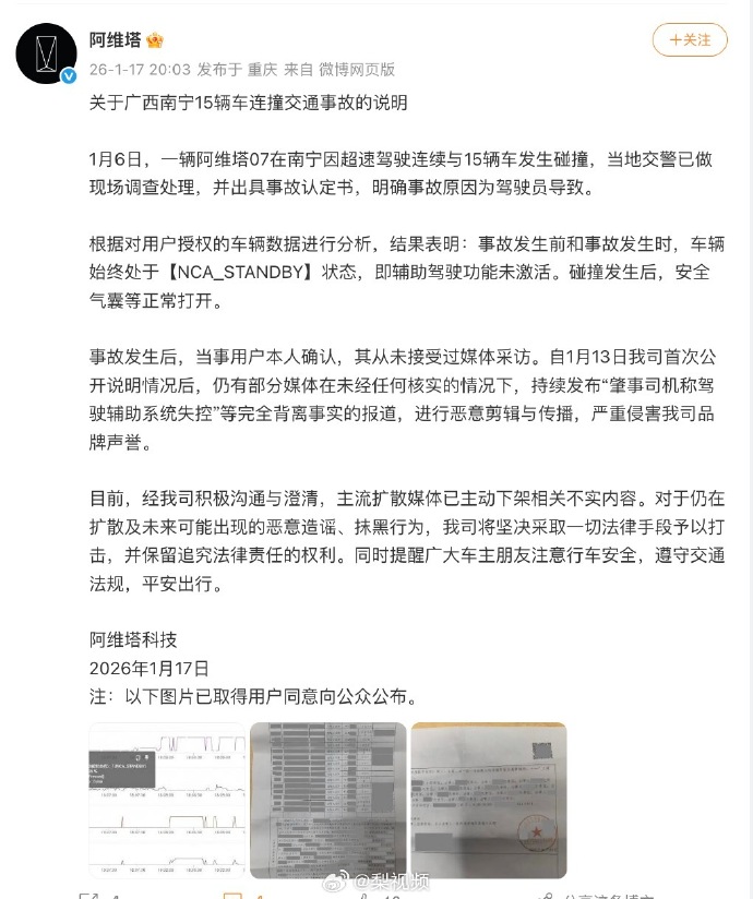 关于广西南宁15辆车连撞交通事故的说明:1月6日,一辆阿维塔07在南宁因超速驾驶连续与15辆车发生碰撞,当地交警已做现场调查处理,并出具事故认定书,明确事故原因为驾驶员导致。根据对用户授权的车辆数据进行分析,结果表明,事故发生前和事故发生时,车辆始终处于【NCA_STANDBY】状态,即辅助驾驶功能未激活。碰撞发生后,安全气囊等正常打开。
