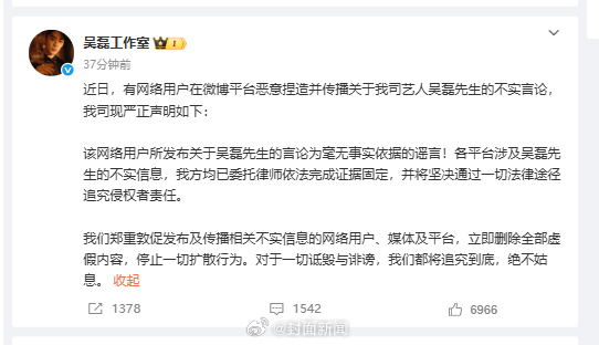 1月18日,发文吴磊你欠我的拿什么还,引发关注。对此,回应近日,有网络用户在微博平台恶意捏造并传播关于我司艺人吴磊先生的不实言论,我司现严正声明如下:该网络用户所发布关于吴磊先生的言论为毫无事实依据的谣言。各平台涉及吴磊先生的不实信息,我方均已委托律师依法完成证据固定,并将坚决通过一切法律途径追究侵权者责任。我们郑重敦促发布及传播相关不实信息的网络用户、媒体及平台,立即删除全部虚假内容,停止一切扩散行为。对于一切诋毁与诽谤,我们都将追究到底,绝不姑息。
