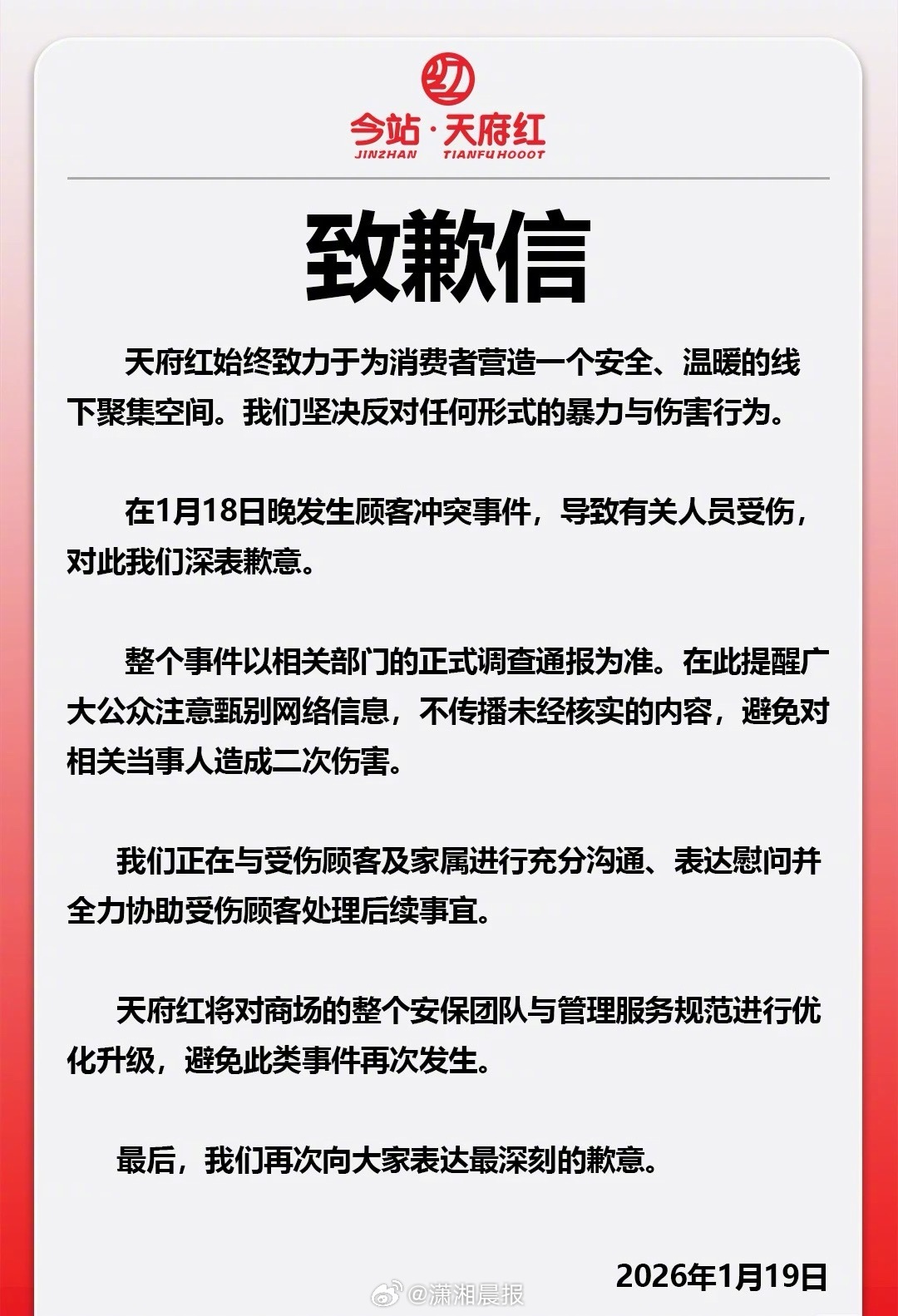 成都天府红商场发道歉信,成都天府红商场就发生打人事件道歉。