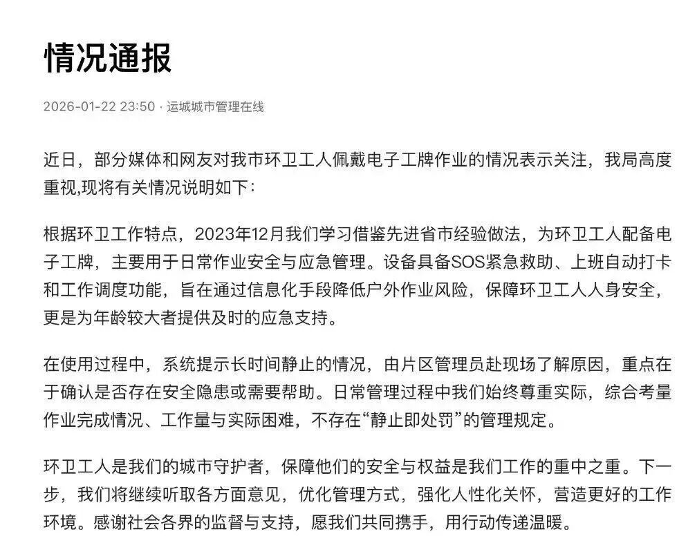 22日晚,运城市城市管理局发布情况通报:根据环卫工作特点,2023年12月我们学习借鉴先进省市经验做法,为环卫工人配备电子工牌,主要用于日常作业安全与应急管理。设备具备SOS紧急救助、上班自动打卡和工作调度功能,旨在通过信息化手段降低户外作业风险,保障环卫工人人身安全,更是为年龄较大者提供及时的应急支持。
