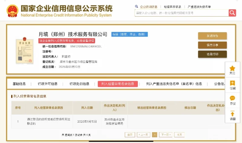 1月23日,南都N视频记者查询国家企业信用信息公示系统发现,“死了么”App开发商月境(郑州)技术服务有限公司,被郑州市金水区市场监督管理局列入经营异常名录,原因为通过登记的住所或者经营场所无法联系。同日,“死了么”App创始人吕先生告诉南都N视频记者,被列入经营异常名录的原因是远程办公,公司没有人员在登记场所里办公。