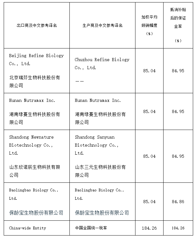 与此同时,裁定中国生产商/出口商保龄宝生物股份有限公司(Baolingbao Biology Co.,Ltd.)的补贴税率为4.54%、山东三元生物科技股份有限公司(Shandong Sanyuan Biotechnology Co.,Ltd.)补贴税率为8.63%、中国其他生产商/出口商补贴税率为8.12%。本案主要涉及美国海关编码2905.49.4000项下的产品。