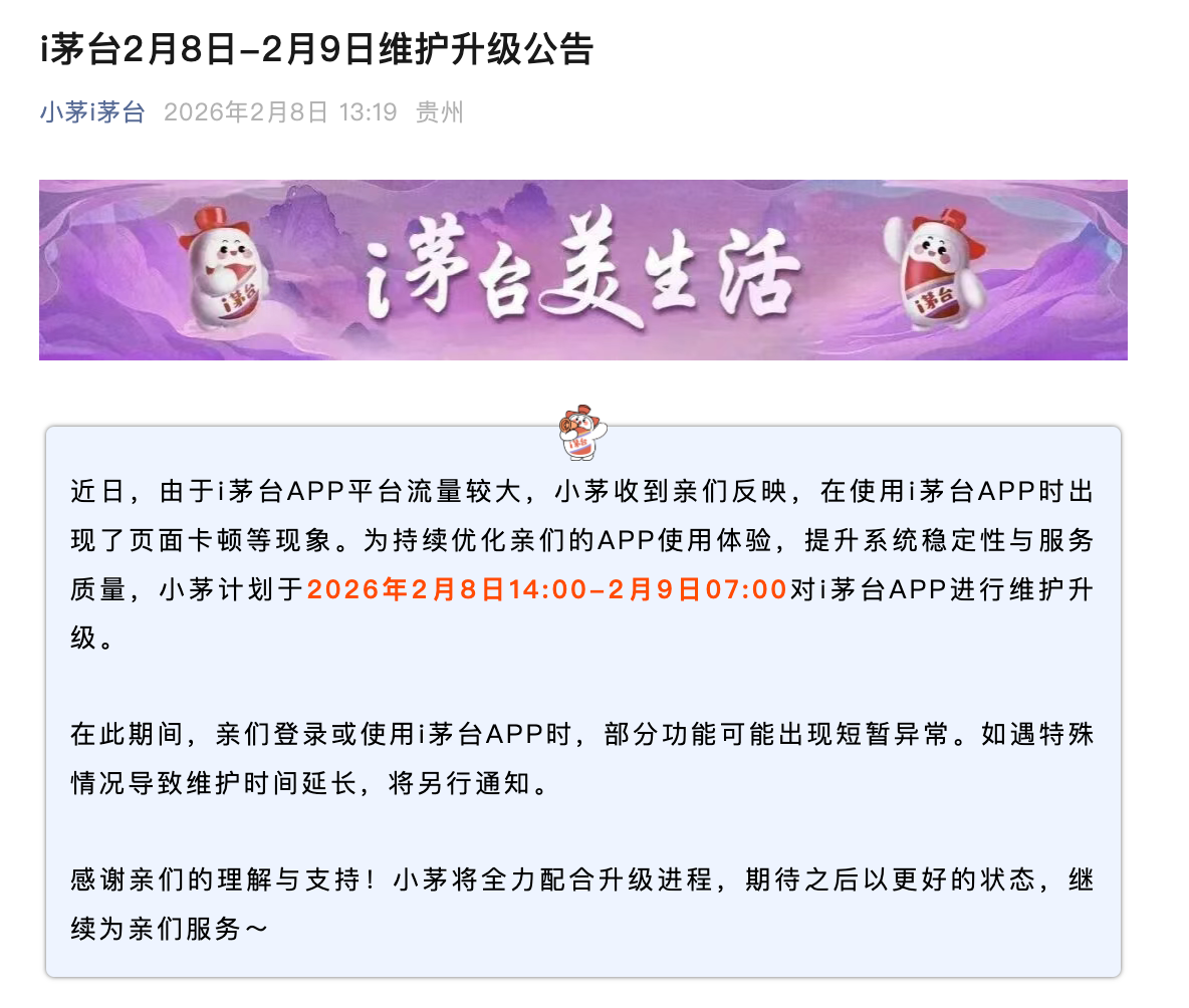 贵州茅台自营电商平台“i茅台”发文称,近日,由于i茅台APP平台流量较大,用户在使用i茅台APP时出现了页面卡顿等现象。为持续优化使用体验,提升系统稳定性与服务质量,i茅台APP计划于2026年2月8日14:00-2月9日07:00进行维护升级。在此期间,用户登录或使用i茅台APP时,部分功能可能出现短暂异常。如遇特殊情况导致维护时间延长,将另行通知。