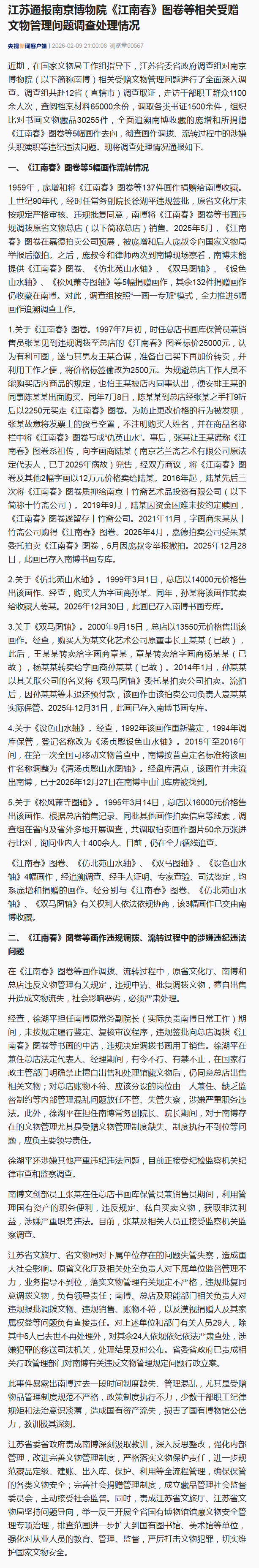 近期,在国家文物局工作组指导下,江苏省委省政府调查组对南京博物院(以下简称南博)相关受赠文物管理问题进行了全面深入调查。调查组共赴12省(直辖市)调查取证,走访干部职工群众1100余人次,查阅档案材料65000余份,调取各类书证1500余件,组织比对书画文物藏品30255件,全面追溯南博收藏的庞增和所捐赠《江南春》图卷等5幅画作去向,彻查画作调拨、流转过程中的涉嫌失职渎职等违纪违法问题。现将调查处理情况通报如下。