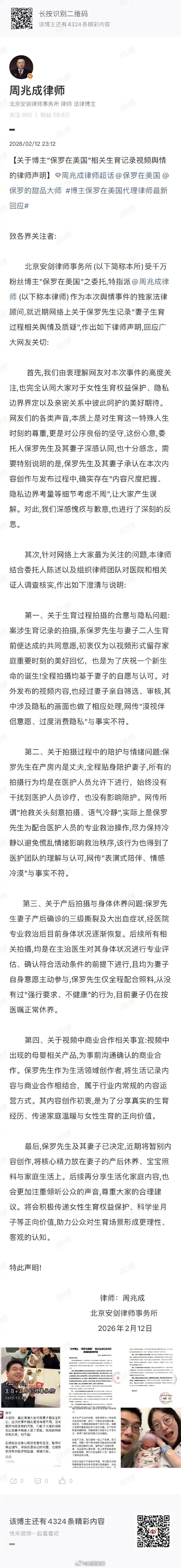 2月12日,发布【博主保罗在美国相关生育记录视频争议的律师声明】。就生育记录视频舆情集中回应:承认内容尺度考虑不周并致歉;澄清拍摄系夫妻共同意愿、经妻子亲自审核,网传“漠视伴侣意愿”“表演式陪伴”不实;产后拍摄均在医生评估、妻子主动参与下进行。保罗夫妇决定暂别创作,专注妻子产后休养及宝宝照料。