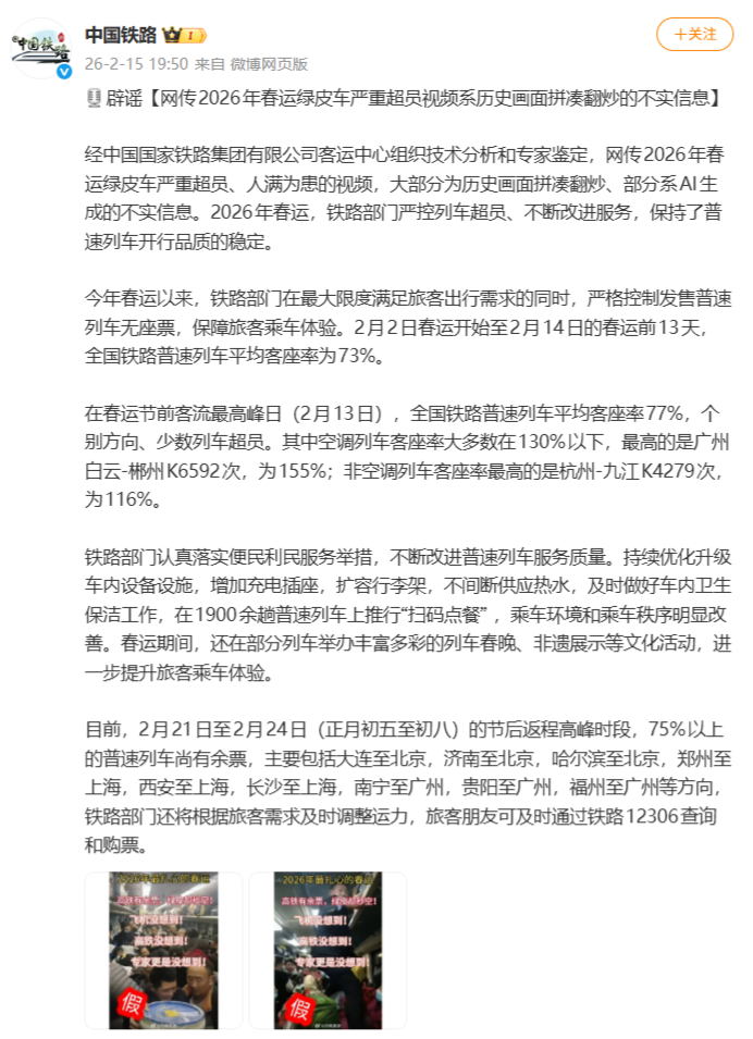 中国国家铁路集团有限公司客运中心于2月15日晚间发布官方声明。声明指出,经组织技术分析和专家鉴定,近期网络传播的2026年春运绿皮车严重超员视频存在不实信息。鉴定结果显示,该视频内容主要由两部分构成:大部分画面系历史资料拼接而成,部分内容为人工智能技术生成的虚假影像。铁路部门强调该视频不符合2026年春运实际情况。官方声明旨在澄清事实,避免不实信息引发公众误解。目前铁路客运系统运行正常,未出现视频中描述的超员现象。