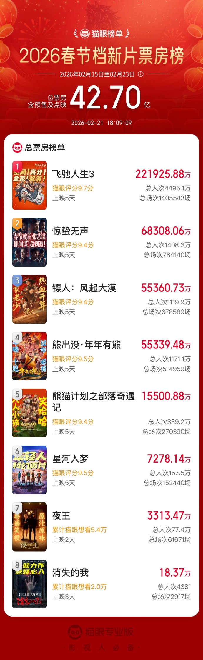 据猫眼专业版数据,截至2月21日18时06分,《镖人:风起大漠》总票房(含预售)超《熊出没·年年有熊》,进入2026春节档新片票房榜前三。