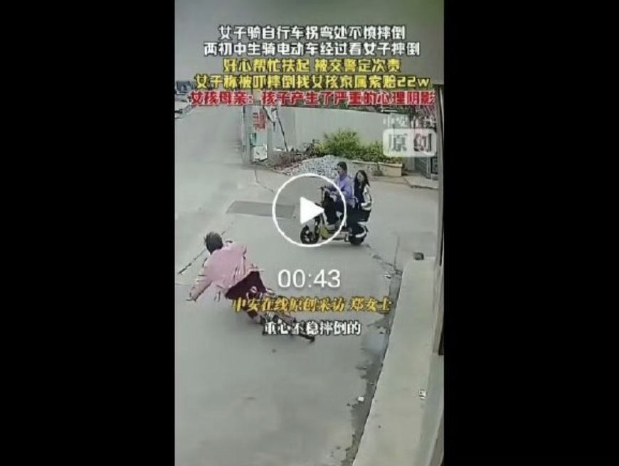 据媒体报道,近日,福建一位老太太骑自行车拐弯时摔倒,两名路过的初中生骑电动车看见后,主动停车帮扶,却被交警判定承担事故次要责任。事后,老人称自己是因受到惊吓而摔倒,向驾驶电动车的女孩和她的监护人索赔22万元,事件引发广泛关注。
