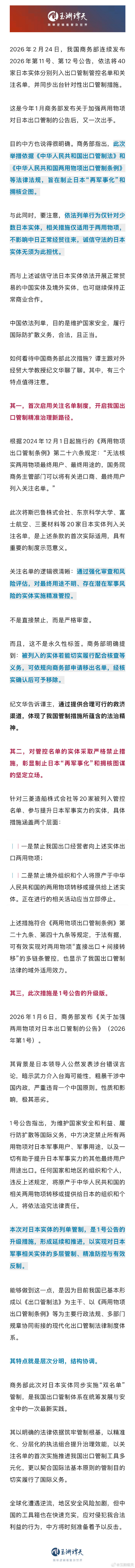 2026年2月24日,商务部依法将40家日本实体分别列入出口管制管控名单和关注名单,并同步出台针对性出口管制措施。这是今年1月商务部发布关于加强两用物项对日本出口管制的公告后,又一次出手。商务部此次措施,有三点值得注意:其一,首次启用关注名单制度,开启我国出口管制精准治理新路径。其二,对管控名单的实体采取严格禁止措施,彰显制止日本“再军事化”和拥核图谋的坚定立场。其三,此次措施是1号公告的升级版。当前,全球化遭遇逆流,地区安全风险加剧,但中国的工具箱也在快速充实,应对侵犯我合法利益的行为,中方将时刻准备着予以反击。