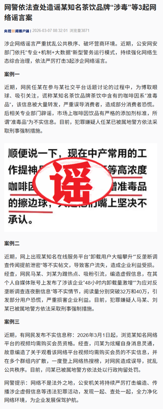 公安网安部门近期查处3起针对知名茶饮品牌的网络谣言案件。主要违法行为包括编造品牌"涉毒"等虚假信息。此类谣言严重扰乱公共秩序并破坏营商环境。执法行动依托"专业+机制+大数据"新型警务运行模式开展。网安部门持续强化网络生态综合治理工作。案件处理体现对涉企网络谣言的零容忍态度。