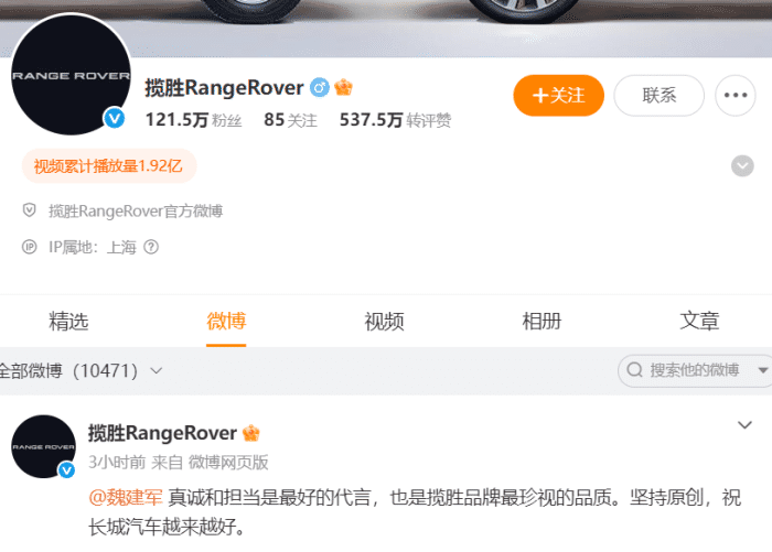 后续!路虎揽胜回应魏建军道歉。