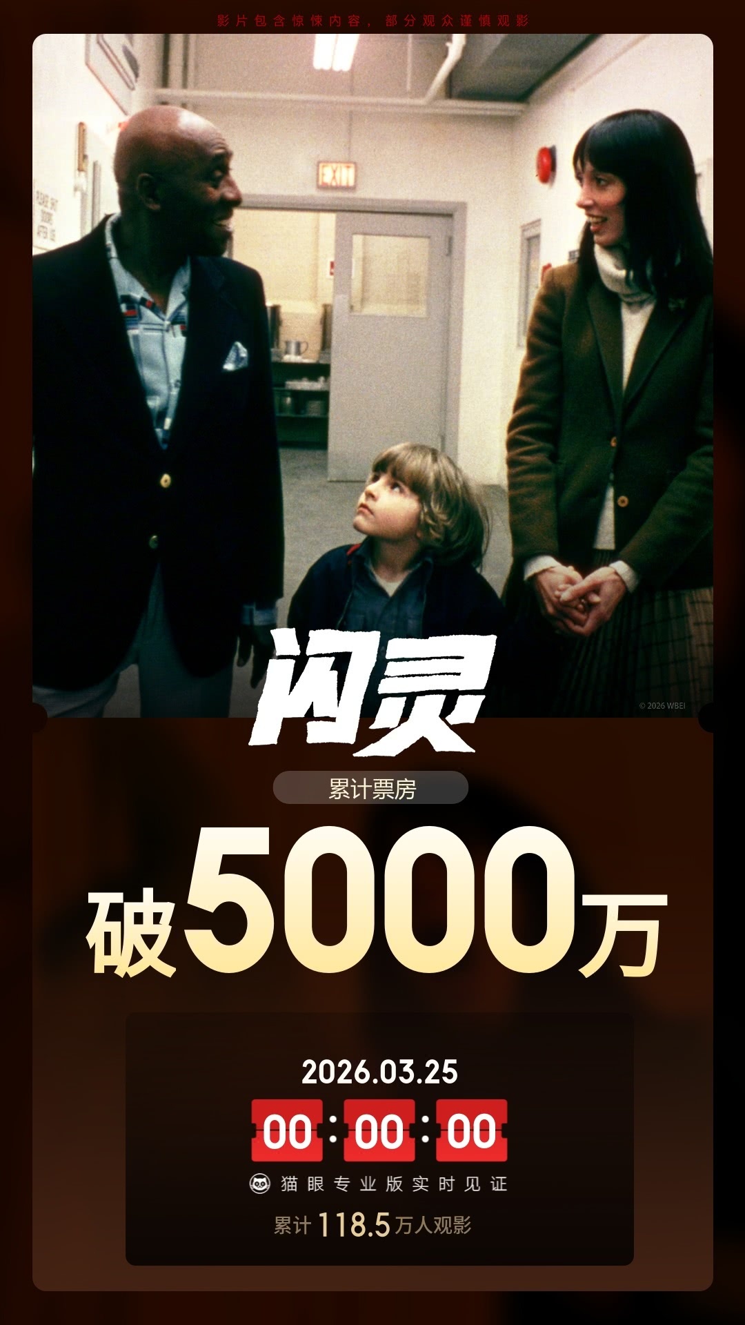 据猫眼专业版数据,电影《闪灵》上映55天,截至3月25日零时,总票房破5000万。