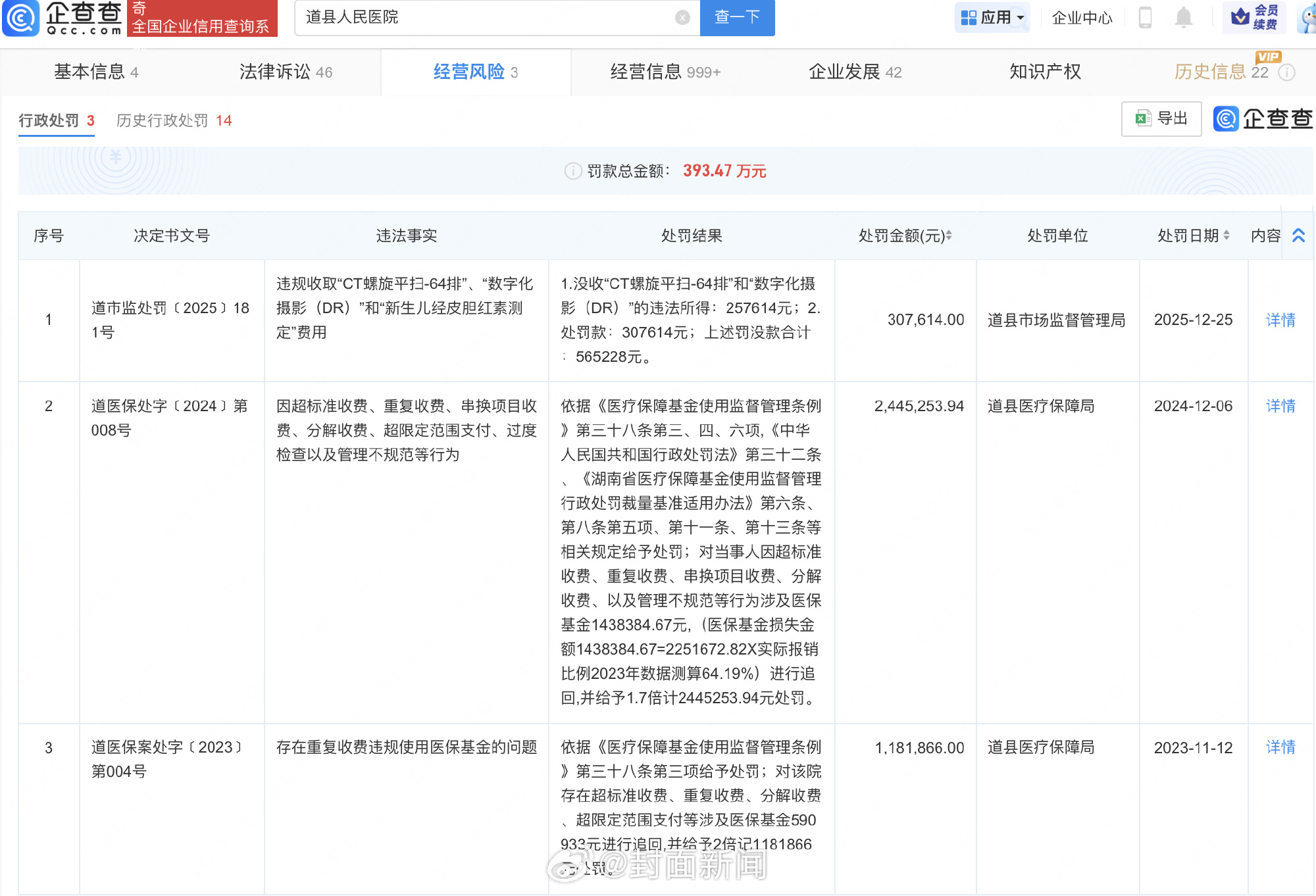 近日,湖南道县市民杨先生反映其妻子在道县人民医院生产后,发生新生儿与产妇先后离世的悲剧。家属质疑医院在诊疗过程中存在多处操作疏漏。企查查APP显示,道县人民医院曾多次被行政处罚,违法事实包括存在重复收费、违规使用医保基金的问题、违规收取新生儿经皮胆红素测定等项目费用及超标准、重复、串换项目收费等行为。目前该医院已被行政处罚罚款共计393.47万元。