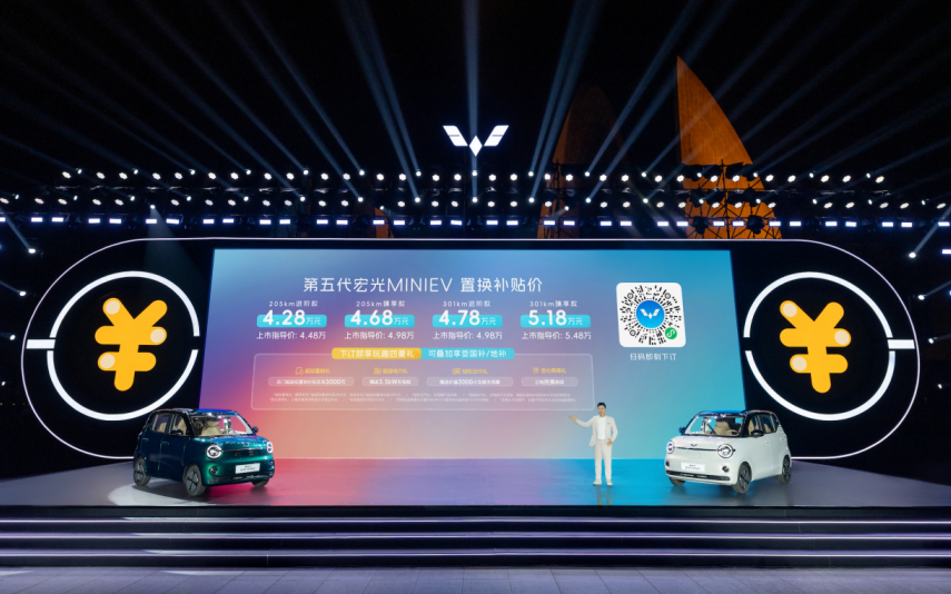 在此背景下,五菱第五代宏光MINIEV上市,置换补贴后售价4.28万—5.18万元。新车定位“四门玩趣代步车”,基于天舆架构-S平台打造,车身尺寸3268×1520×1575mm,转弯半径4.5米,后排标配电动升降车窗,后备厢最大可拓展至838L。